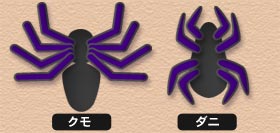 生物学的分類では、クモの親戚です。ただし、クモや昆虫は、頭、胸、腹が分かれている(クモの頭と胸は一緒)のに対し、ダニは部位ごとに分かれておらず、ひとつしかありません。
