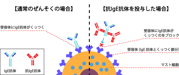吸入ステロイドや長時間作用性β2刺激薬などを使用していても、発作が頻繁に起きてしまう重症喘息の場合には、「抗IgE抗体」という注射薬が用いられることがある。抗IgE抗体はIgE抗体とくっつくことで、マスト細胞の受容体にIgE抗体がくっつくのをブロックして化学物質の放出を防ぎ、アレルギー症状を抑える。抗IgE抗体の使用は、炎症が起きる、気道が狭くなるなどの個々の症状への対処ではなく、アレルギー反応の仕組みそのものに基づいた、根本的な治療だといえるだろう。
