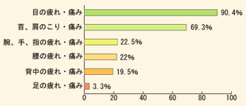 1位は「目の疲れ・痛み」で、なんと全体の9割とダントツ。2位は「首、肩のこり・痛み」。これも約7割と相当数の人に見られる症状であることがわかる。「腕、手、指の疲れ・痛み」「腰の疲れ・痛み」「背中の疲れ・痛み」も、それぞれ2割前後と少なくない。
