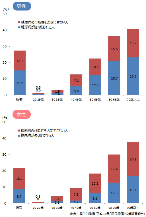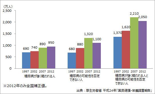 「糖尿病が強く疑われる人」(約950万人)と「糖尿病の可能性が否定できない人」(約1,100万人)を合わせて、糖尿病の推定患者数は約2,050万人にのぼるといわれていますが、その約3割はほとんど治療を受けたことがないといいます(厚生労働省:平成24国民健康・栄養調査報告)。