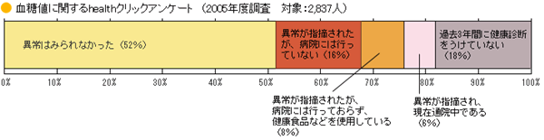 healthクリックが行ったアンケート調査によると、健康診断で「血糖値が高い」といわれ、かつ通院をしている人は全体のわずか6%でした。