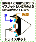 涙は、泣くとき以外にも普段少しずつ出ていて、眼の表面の保護や、栄養分・酸素の供給、ゴミ・細菌の侵入を防ぐなどのはたらきをしています。この涙が乾いてくると、角膜の上にドライスポットという、穴のような物があいてしまいます。通常であれば、そこをすぐ涙がおおい、やがて穴は塞がっていくのですが、ある一定以上に涙が減り続けると、穴は残ったままとなり、最も傷つきやすい角膜が露出します。また、私たちの眼全体に涙をゆきわたらせてくれるのが瞬きなのですが、パソコンなどを凝視すると、瞬きは通常の1/4にもなります。