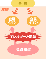 金属アレルギーは、繰り返し同じ金属を使用しているうちに溶け出した金属イオンが体内に入りこみ、免疫のはたらきで異物だと記憶され、次に同じ金属に触れたときにアレルギー反応を起こしてしまう。また一度なると一生続くため、なかなか厄介なもの。