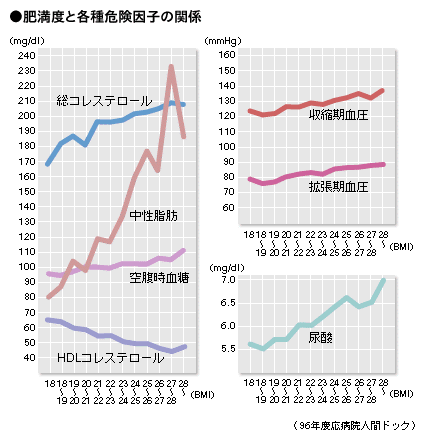 運動不足と食べ過ぎが続くと、栄養過多になります。余った栄養分は、血液中に入り、高血糖・高脂血状態になります。このように血液中に流れ込んだ脂肪(血中脂肪)は、長い間に血管内壁に堆積して、血管のアテローム変性(動脈の内膜やその下の脂質が巣状になって滞留すること)を起こします。アテローム変性を起こした血管は柔軟性を失い、動脈硬化となります。このような血管は、内径が細くなっていますので血液の流れがスムーズにいかなくなり、心臓は充分な血液を送ろうと血圧を上げ、その結果、高血圧状態となってしまいます。