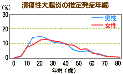 1970年代に特定疾患(難病)として指定された潰瘍性大腸炎は、かつてかなりめずらしい病気とされてきた。ところが最近、どういうわけか患者数は急増中。1985年には1万人超だったが、2002年には、なんと7万7000人以上(平成14年度 特定疾患医療受給者証交付件数より)となっている。特定疾患のうちでも、最も発病者が多い。しかも、発症しやすいのは若年層。男性では20代前半、女性は20代後半が目立つ。