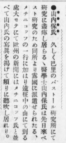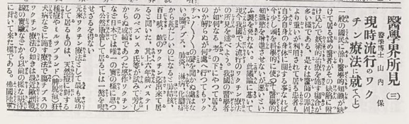 山内保は帰国後、日本の医療の現状について批判をしています。例えば読売新聞の「医学会所見」という論説では、「我が国の医学者がいかなる考えを用いてやっているかわからぬが、腸チフス、結核、肺炎、淋病、化膿症、肺結核、百日咳、ニキビのワクチンまでできていると聞いた」「パスツール研究所で効果が確認できなかったインフルエンザワクチンまで製造されている」と激しく批判しています。