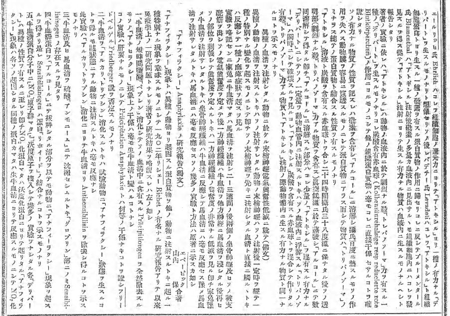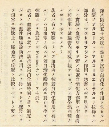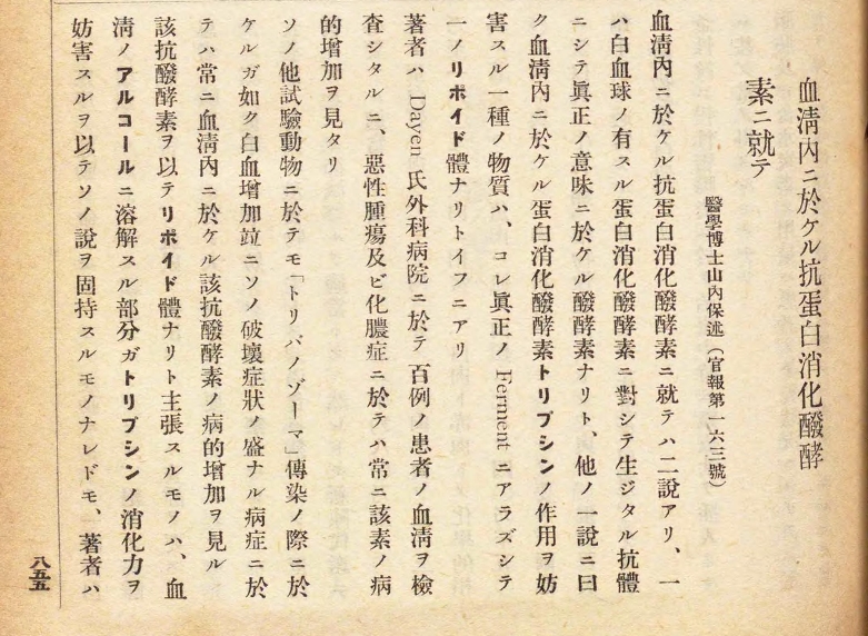 「血清内における抗タンパク消化酸酵素について」中外医事新報 57巻 855-856 1913年(大正2年)という論考を日本語で書いています。