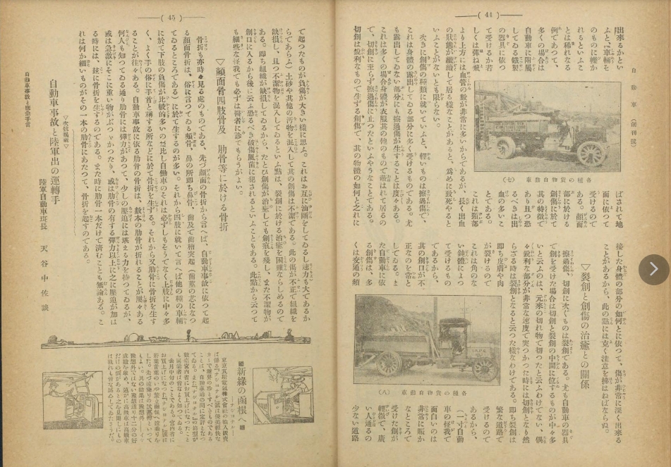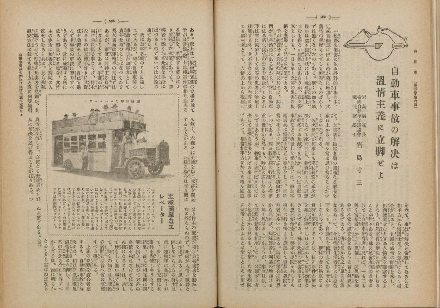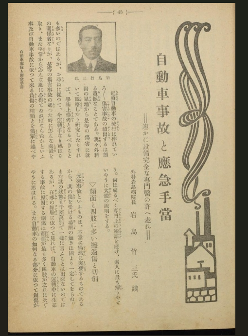 上記は「自動車」という雑誌の1920年に岩島が書いた記事です。文中、交通事故による外傷が増えていること、被害者加害者の間にトラブルが生じるが双方ともに温情主義をもって解決に当たるようにと説いています。